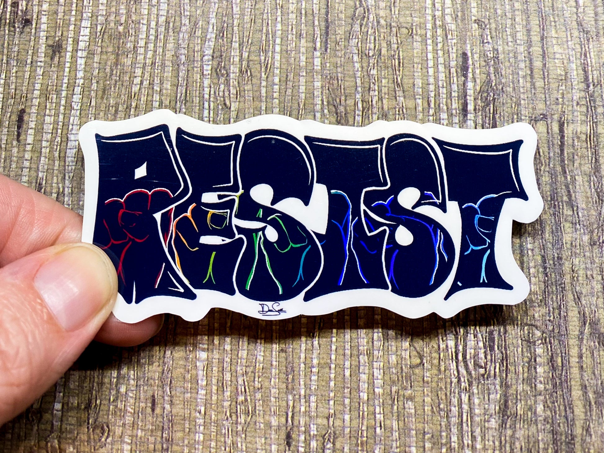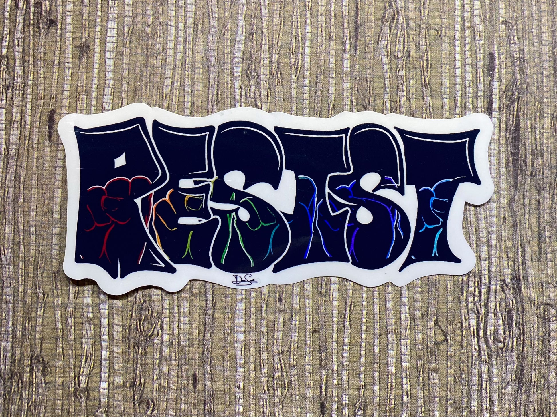 This sticker features graffiti style text with five fists in a rainbow of colors within the word 'Resist'.