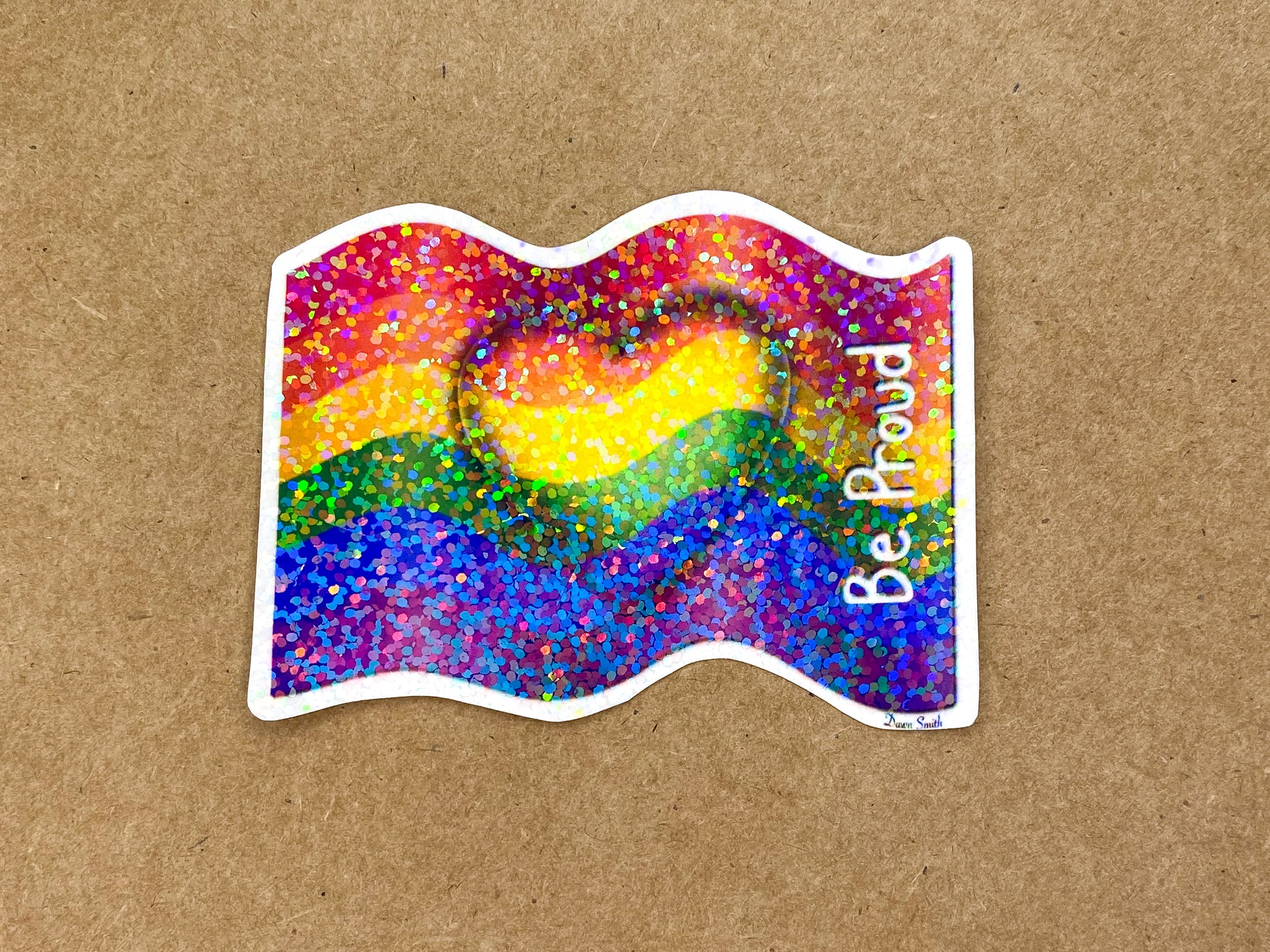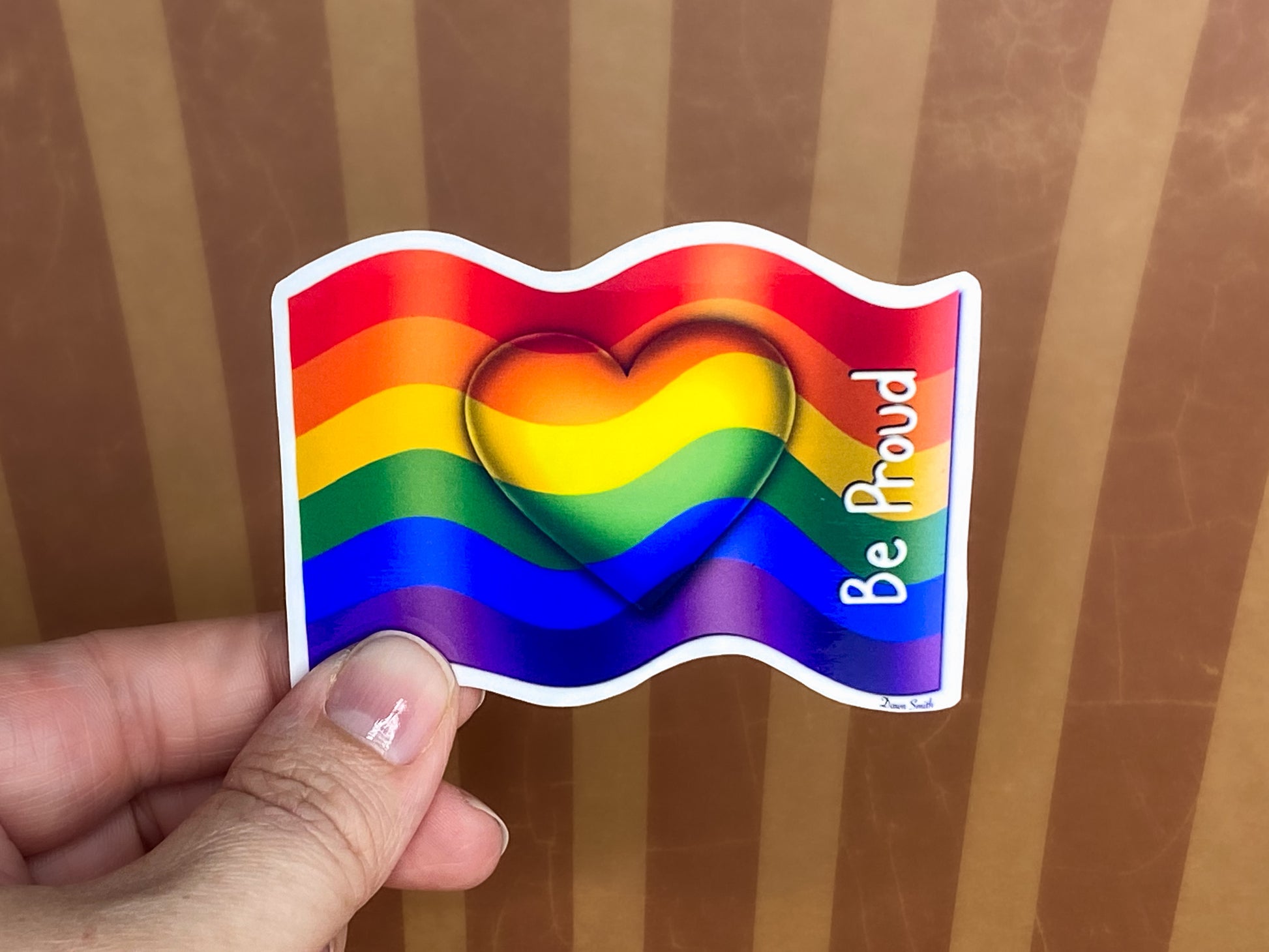 This sticker features a silhouetted heart on a standard rainbow flag with the words 'Be Proud' on the right hand side.